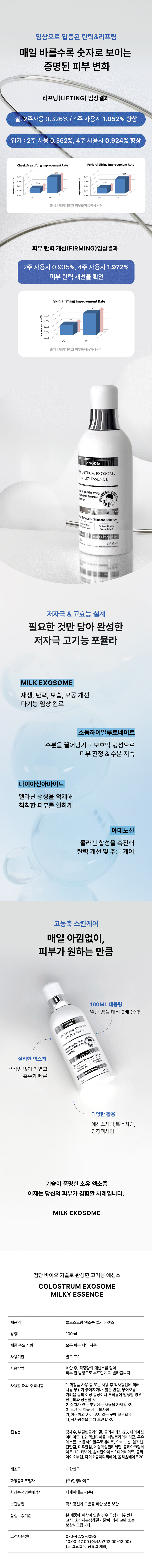 - 고농축 초유 엑소좀과 나이아신아마이드, 히알루론산을 담아 피부 탄력·보습·진정을 한 번에 케어하는 멀티 기능 에센스. 부드럽고 촉촉한 밀키 텍스처로, 예민해진 피부도 편안하게 감싸며 깊은 흡수력을 자랑합니다.